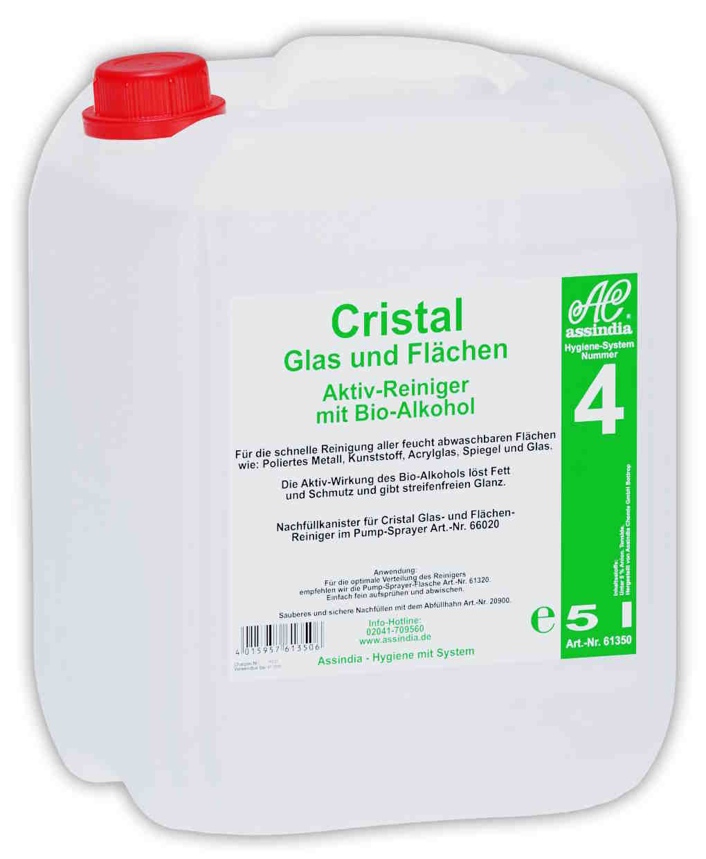 Cristal Glas und Flächen ReinigerGlasreiniger im Nachfüllkanister mit Bio-Alkohol.Klassischer Alkoholreiniger zum aufsprühen und abwischen. Löst Fett, Schmutz und Fingerabdrücke. Reingt aktiv mit Bio-Alkohol. Reinigt Spiegel, Glas, poliertes Metall und Kunststoffefrei von SalmiakgeistDer klassische Alkohol-Reiniger eignet sich hervorragend für die schnelle Reinigung von Glas und allen anderen feucht abwaschbaren Flächen und wird am besten mit einer Pump-Sprayer-Flasche verwendet.Datenblatt
