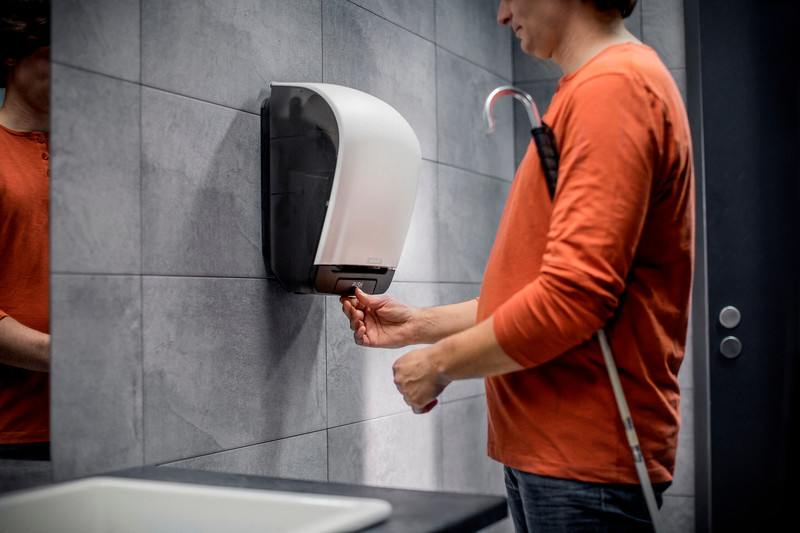Die gesamte Papiermenge auf der Rolle wird aufgebraucht. Bei einem Durchmesser von ca. 7,5 cm fällt die Rolle automatisch in die Restrollenposition. Sie können dann bereits eine neue Rolle in den Spender einlegen. Der Übergang zur neuen Rolle erfolgt dann automatisch, wenn die Restrolle aufgebraucht ist